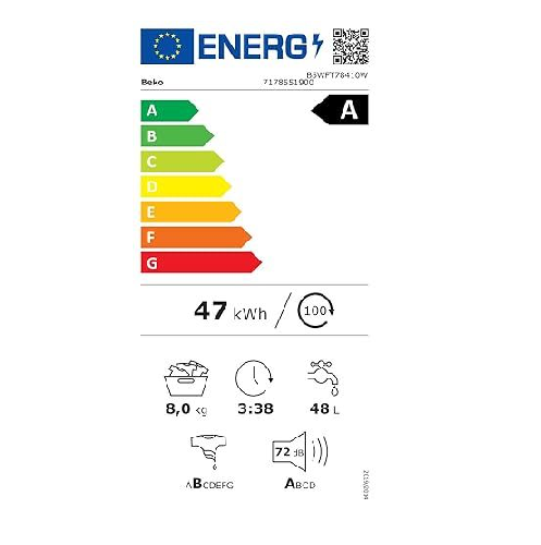 - Βραβευμένο με ενεργειακή κλάση A (κλίμακα: A έως G), αυτό το πλυντήριο ρούχων διαθέτει εξαιρετικά χαμηλή κατανάλωση ενέργειας.