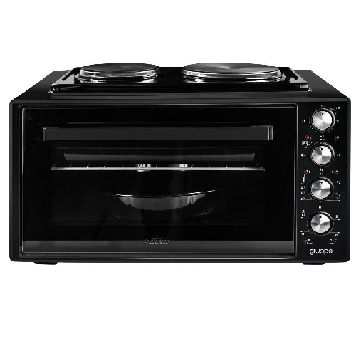 Φουρνάκι-κουζινάκι Gruppe I-28HP, με χωρητικότητα φούρνου 50lt και δύο εστίες στο επάνω μέρος. Διαθέτει 4 λειτουργίες ψησίματος, δυνατότητα κυκλοφορίας θερμού αέρα κατά τη λειτουργία του και ρυθμιζόμενο θερμοστάτη.